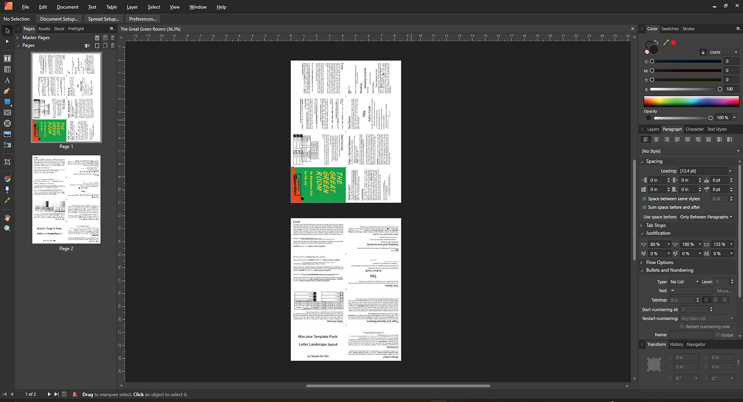 Thus far I have a cover and a project laid out in Publisher using the mini zine template by the excellent Speak The Sky.
