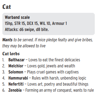These are kittens, though. And there are two of them. Both being Warband scale wouldn’t make sense. That would lead to a brutal scenario for PCs who want to fight, too. That being said, I do want these kittens to be strong enough of a challenge that outright combat is not a very good idea.