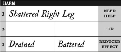 This character has three harm: a “Shattered Right Leg” (level 3) plus “Drained” and “Battered” (level 1). If they suffer another level 1 harm, it will move up to level 2. If they suffer another level 3 harm, it will move up to level 4: Fatal.