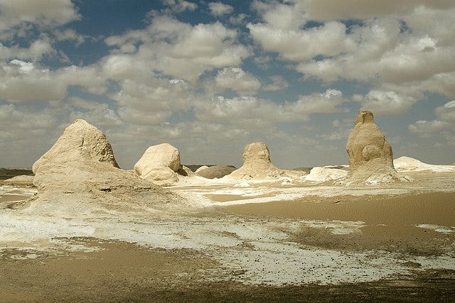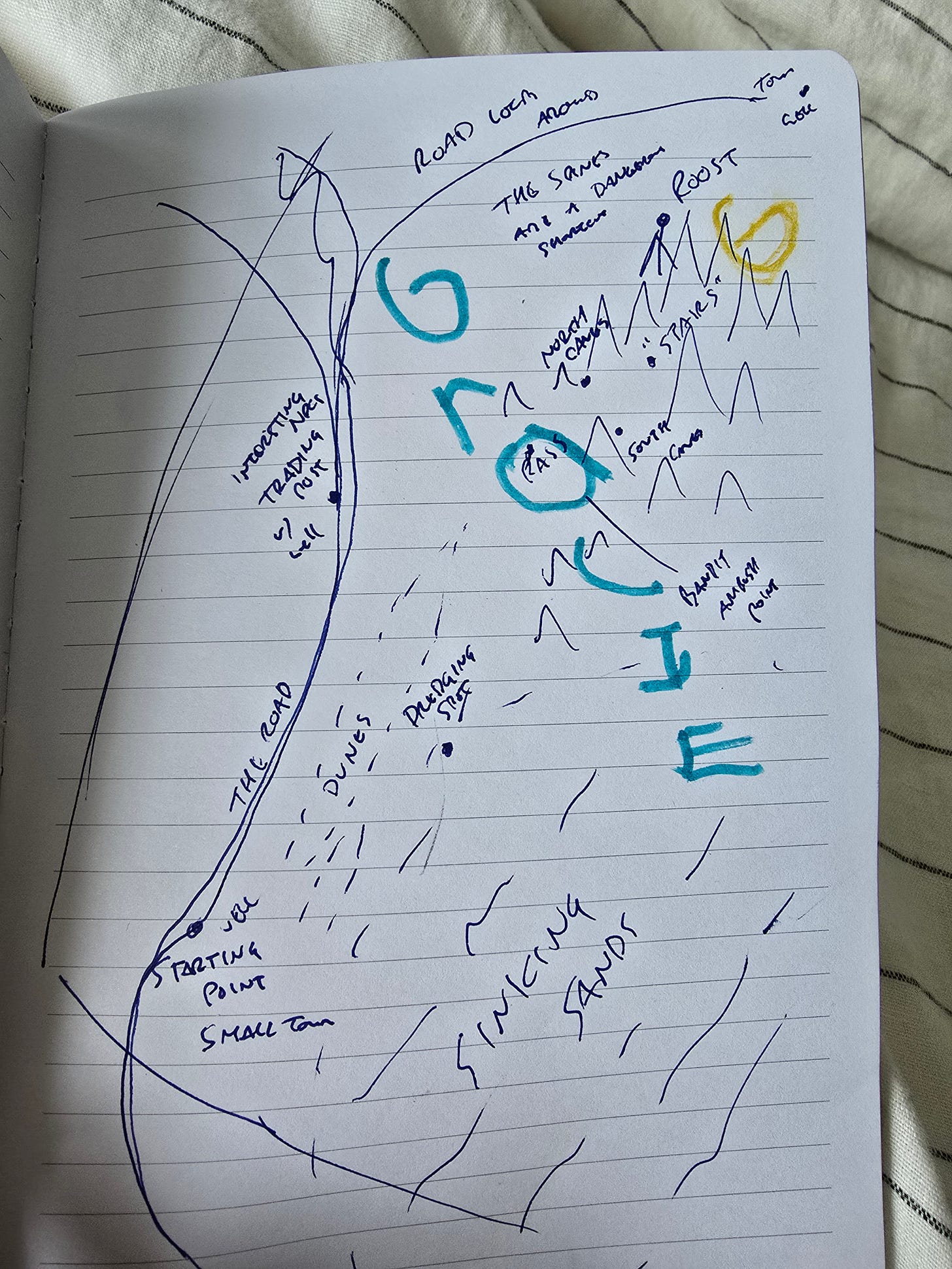 This is designed to be an intro adventure where players go to the roost of a bird whose feathers can be used to purify water. Travel along the road is safe enough. You need to veer off into the rocks for your prize, though. There is a pass that bandits use for ambushes and then cave systems in the north and south. One of those systems will have it’s own mini map that lets players delve underground without fear of the sun. Sinking sands is something I want to include elsewhere, too. This is like my world’s ‘ocean’. The sand is thin there, there are currents and waves, and if you step into it, you drown. People dredge the ‘coasts' of these oceans with grappling hooks hoping to bring up treasure. What else might they hook and bring to the surface, though?