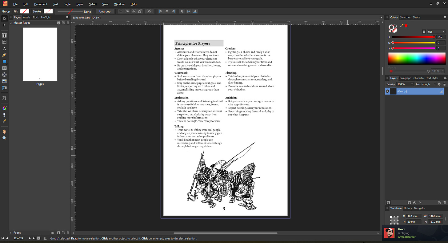 I was lucky to have some time this week that wasn’t entirely swallowed up by my main job or my main side job. I didn’t get a ton of TTRPG stuff done, but the little I did do was quite important. Furthermore, in doing these things, I felt a little spark of excitement for Sand & Stars. That’s something I had missed for the last few months, partly because editing can be very boring and partly because life has had its challenges over that span. But it feels good to look at this project as a whole right now and push it a little closer to completion.